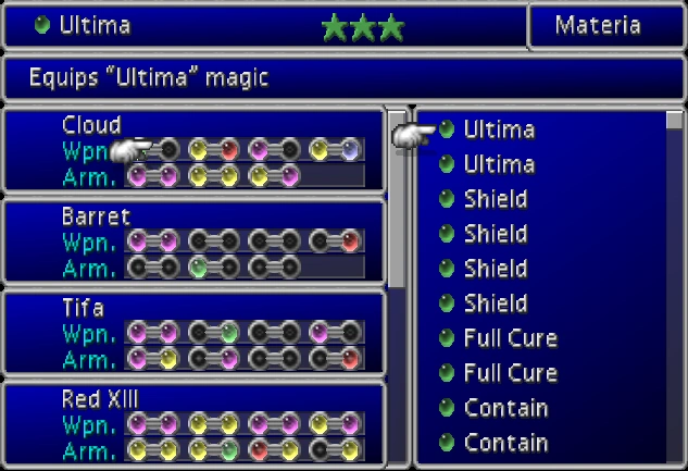 | MATERIAS MAESTRO:Las conseguirás de la mano del viejo de antes cuando venzas a ARMA ESMERALDA, la que hay bajo el mar. Estas materias disponen de todas las magias, todos los comandos y todas las invocaciones en tan solo tres; una verde, otra amarilla y otra roja. |